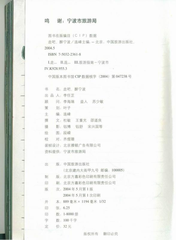 在此将中国旅游出版社出版,连峰主编的《走吧醉宁波》一书象山部分扫描图上传上来,供大家阅读、了解。最后一页是《走吧醉宁波》版权页,以示对著书者的尊重。