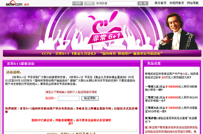 本次活动是为了感谢长期以来对《非常6+1》大力支持的每一观众,同时为了回报广大观众多年以来对本节目的赞助和支持,所以活动特在手机平台抽选幸运用户,抽选的号码面向全国每一位拥有手机号码的用户,只要您有号码,就有机会被选中。活动主办方为非常6+1节目组,活动期间,由工作人员在公证的监督下进行抽选!在移动平台中随机抽选一组有效移动手机号用户,选中的用户以一组普通网络虚拟电话短信形式进行通知。选中的幸运用户只需根据短信上的提示凭个人验证码登陆活动网页填写好个人领奖表格即可领奖。
