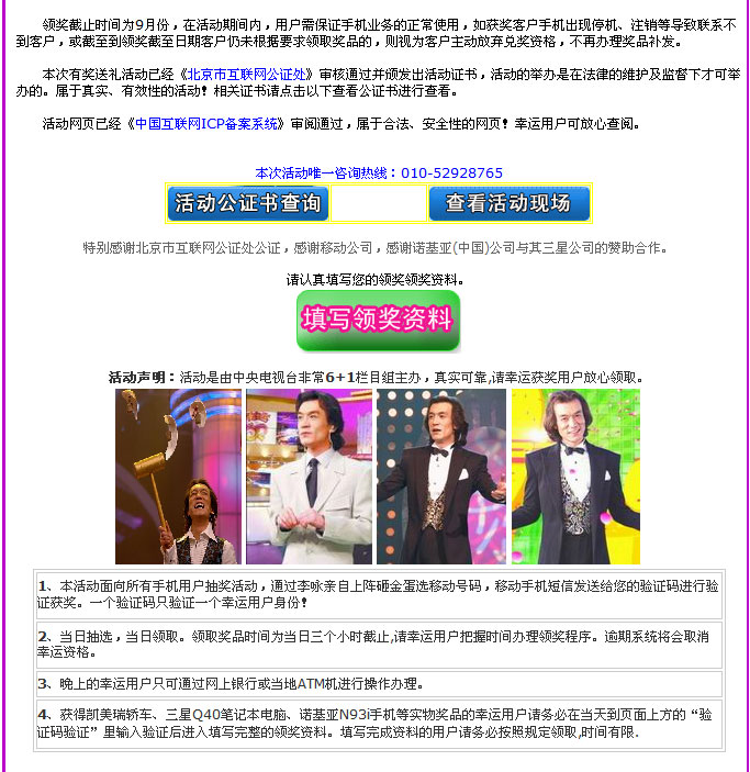 本次有奖送礼活动已经《北京市互联网公证处》审核通过并颁发出活动证书,活动的举办是在法律的维护及监督下才可举办的。属于真实、有效性的活动!相关证书请点击以下查看公证书进行查看。