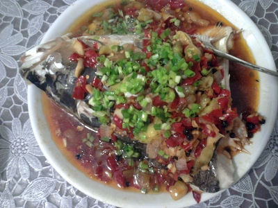 鱼头太大了,俺家的锅只能半只半只蒸~ ,出锅前加把葱花儿,这颜色,感觉真好!