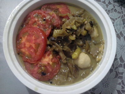 酸菜锅底+加粉条+加西红柿片=美味酸菜粉