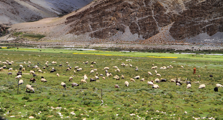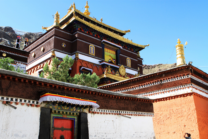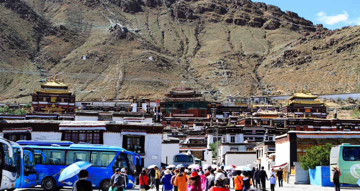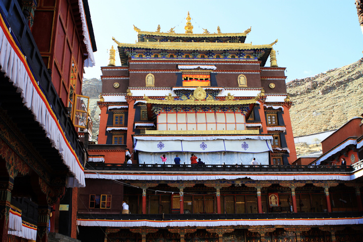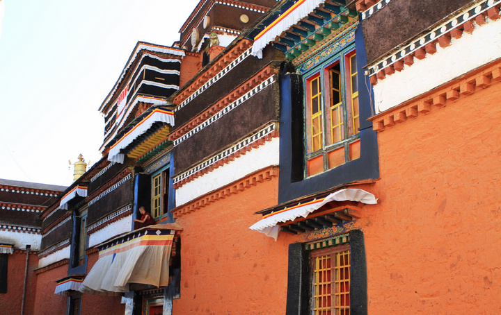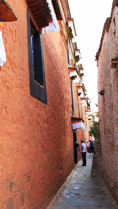 远远看去,一片白红黑相间的建筑群落,的确神似。白房子、红房子、金黄顶、石板路、红衣喇嘛、轻柔的和风、善意的微笑。也许是受了羊湖美景的影响,我都不太愿进去看那些人潮汹涌的殿内景观,是想要一种回避,或是逃避?不知道,哪怕算它这只是短暂的休息吧。