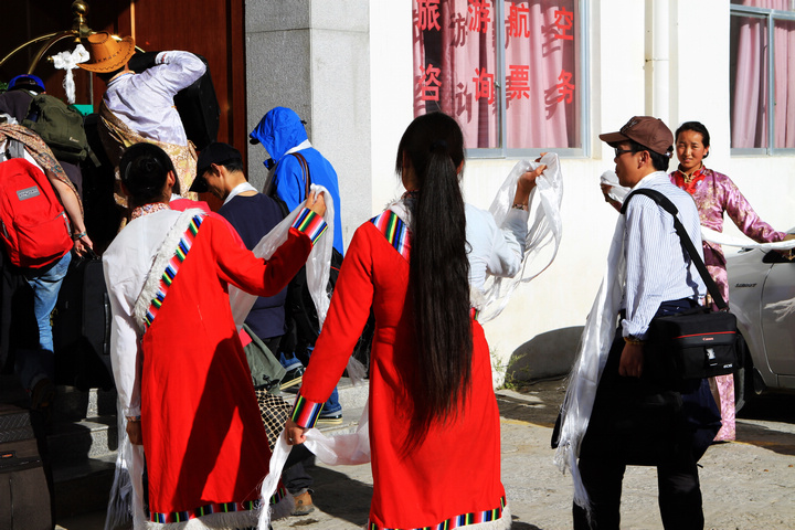 晚上入住当地的久木亚美酒店,这是个四星级的酒店,条件还可以。我们到达的时候,酒店的员工还敬献哈达在门口欢迎呢! |