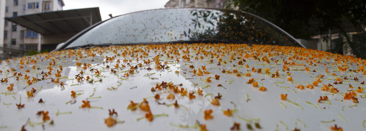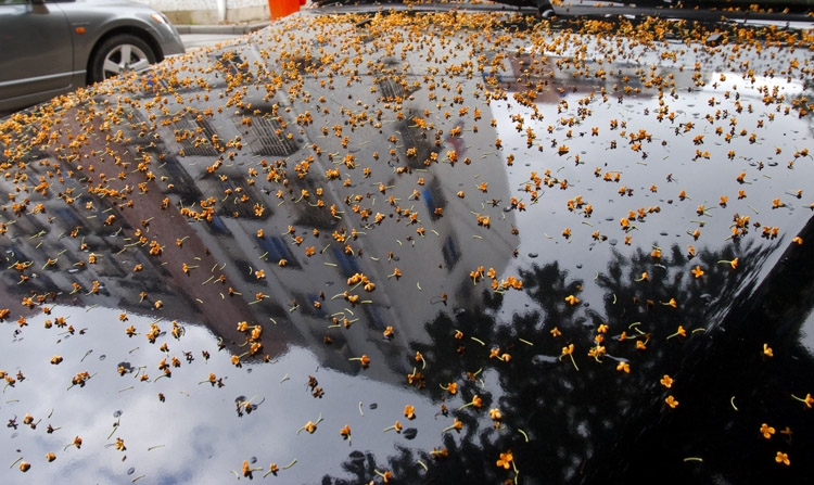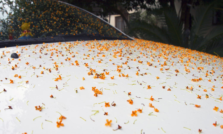 今天一早,记者在丹峰小区、文峰小区等社区看到,几乎每一颗桂花树下都铺满了厚厚的黄金桂,虽然香气淡然,但画面煞是好看。有些车辆正好停在桂花树下,车身撒满了金黄色的桂花,成了名副其实的花车。好多过往的市民看到这个场景,都连连为眼前的场景叫绝:“太美了!”