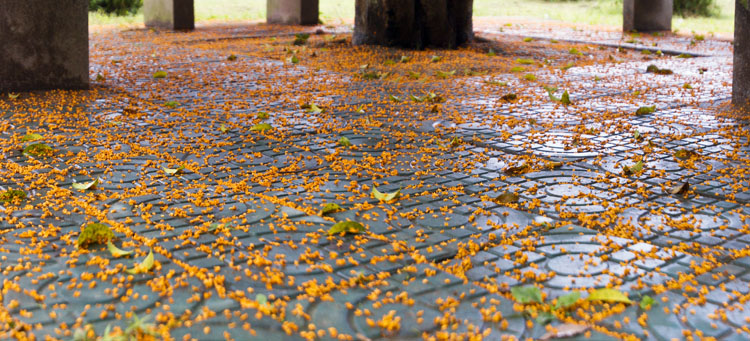 10月10日半夜时分,开始淅淅沥沥下起了雨。近期正是我县各地桂花全面盛开的时节,原本天气晴好,随处可以闻到浓郁的桂花香,这场秋雨却让大量桂花提早“下岗”,闻香时节将明显缩短。但是,秋雨打桂花,换来的却又有另一番美丽场景,桂花树下变成满地的黄金甲。