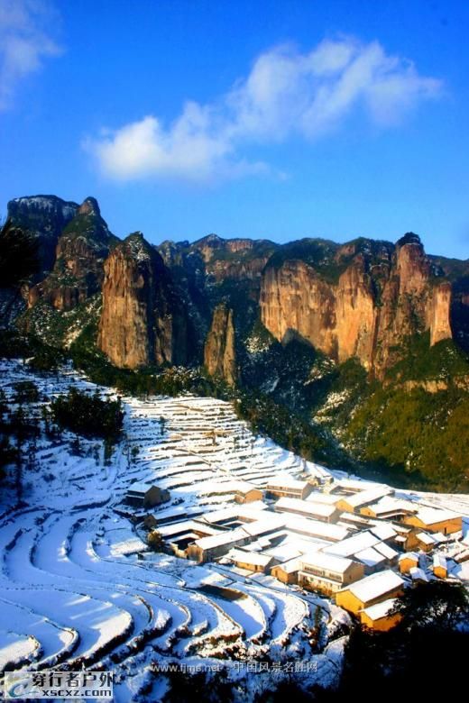 仙居公盂背:仙居田市镇一带,是坐落在海拔600M的高山村落。四面奇峰环绕,峰顶海拔在1000M上下,村庄被山峰围成了一个小小的盆地。攀上村南的公盂背,美景可尽收眼底。盂景区以岿巍著称,地型构造呈多级梯状,海拔为1200米左右,整个公盂巍峨鼎立,气势峥嵘,山崖连着山崖,横亘无际,各峰离立,自为一体,石林崖壁,各有风采。主要景点有:柯九思故居;二十四郎;公盂崖;竹林;神龙瀑;双狮守天门;龙母洞;旗杆岩;小龙门。公盂岩位于浙江仙居公盂岭公盂岩南面。为东西走向的一片巨型峭壁,长1200米,高150—200米,崖壁陡峭,气势磅礴,西侧下方有一崩塌残余,色彩丰富,光滑平整,上部突出,下可避雨,中部纹理丰富,宛若摩崖石刻,顶部平坦,有可能是残余古夷平面。崖壁突兀孤立在山坡之上,深沉厚重。若转至侧则瘦削如刃,变化多端,移步换形,或象大鳄鱼,或象犀牛,有“横看成岭侧成峰”之妙。
