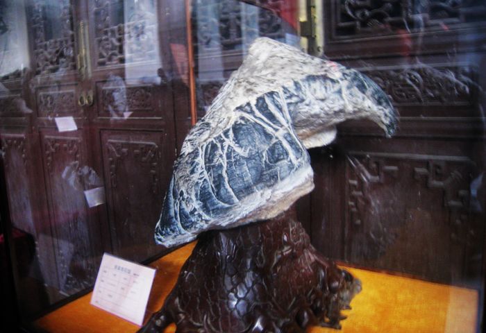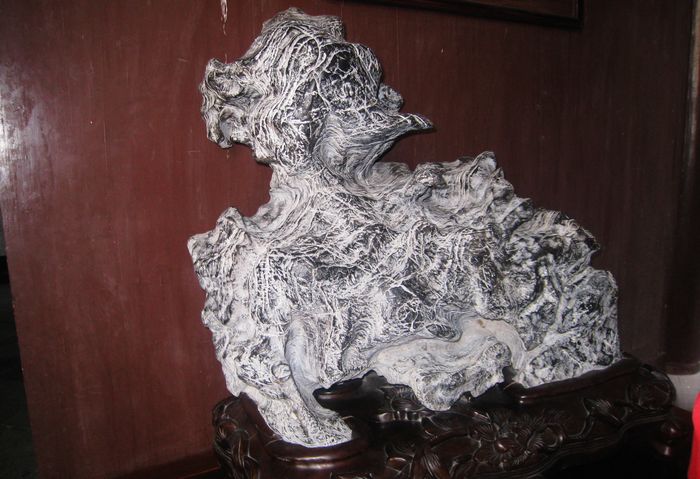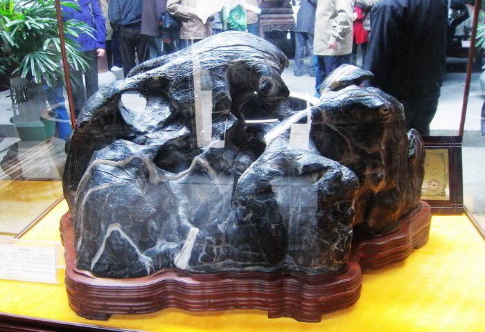 灵壁石产于安徽省灵壁县的磬石山,其天然成形,肌肤沟壑纵横、粗犷雄浑,给观赏者一种凝重感。灵壁观赏石分黑、白、红、灰四大类一百多个品种,其中以黑色最具特色。观之,其色如墨;击之,其声如磬。其形或似仙山名岳、或似珍禽异兽、或似名媛诗仙,石体融透、漏、瘦、皱、伛、悬、蟠、色,以及音韵之美等诸多美学要素,被国内外石艺界誉为“天下第一石”。