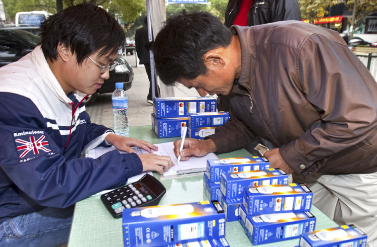 象山同乡网讯 只需用一半的钱就可以买到同样的节能灯泡。11月5日,县节能办和县经发局联合在丹城公园门口推广财政补贴高效照明产品。