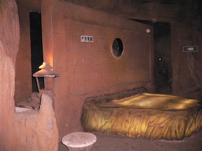 真可谓“玄机一破天外天”,游人在此体验“小龙女”神秘生活的同时,也不得不佩服金庸大侠神奇浪漫的想像力。在这里你还可以领略到“有钱能使鬼推磨”、“水往高处流”、“万丈深渊”等奇景。(小龙女的冰床)