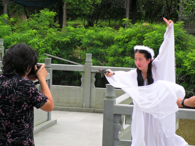 在归云庄内看到一个拍艺术照的,从而也揭穿了一个秘密,为何古装拍摄时总是衣袂飘飘?原来旁边有个人在用力抖动着衣袖。