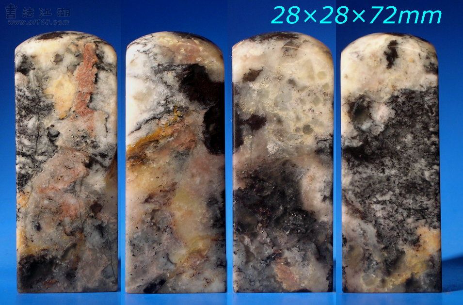 《篆刻针度》赞大松石其质类玉,间有洒墨黑斑,文采流丽。咏《大松石》有句:“洞天万山骨,色相百变成;余分为春冻,中有红猩猩。”节之先生对新近的大松石的颜色是这样描绘的:“常见的多紫绀色或蓝色斑点带有冻块的;有纯白色不透明的鸡骨白”,更有佳品,近似昌化产微透明的“藕粉冻”色。总之,由以上几种颜色为主,相互渗透融化,以至“色相百变成”。
