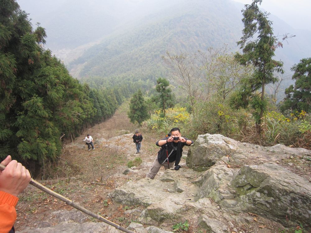 早上6点天还黑黑的,我们就上车出发,到西周车站叫了面包车,一直开到儒下洋尖岭头村,我估计这个村庄是象山最偏僻的村了,7点40分整队上山,一路全是鹅卵石的山路,不一会领队老林在喊‘到宁海了’,等我们爬上一个小山头,果然啊,一块界碑立在那里,难道这么快就要到了?很轻松嘛我心里在嘀咕。可是接下来才是真正的魔鬼爬程啊,先是有大概60度角的防火带,一失脚你估计就滑在山脚了,别人也帮不上忙,大家都互相鼓励小心翼翼的爬上一个山头,这时候雾越来越大,也许是山高的关系,接下来路没那么陡了,可是脚下全是大大小小的石头,大家都见缝插针一步一步的向上前进,一个山头又一个山头,也不知道翻越了几个,寒气越来越重,雾也越来越浓,基本上看不到前面的山头,总算是走着没有向上的感觉了,难道就快到了吗?可是接下来才是全程最艰难的,其实根本没有路,那是以前户外有走过的痕迹,现在基本被一人高的荆棘铺满了,哈哈,歌里唱的不怕荆棘铺满路,原来就是这样的路,大家互相提醒小心的往前行,这段路程估计走了两个小时,走到高山草甸一检查,身上满是一条条的血痕,腿上最多了,也不知道爬了多久,只听老林说‘东搬山顶到了’,果然啊,在一片荆棘中,立这一个小小的石桩,我看了下时间,10点40分,刚好3个小时啊。大家都饿了,于是就在山顶石头堆上短暂休整。接下去往宁海的茶山东海云顶进发,通往东海云顶的登山步道就在眼前,可是路没了,也就是以前的痕迹找不到了,我们被一人高荆棘包围着,大家都说‘不管它了,就往登山步道的方向走,’于是大家在老林带领下迎着荆棘小心的走,出来啦,大家都欢呼雀跃,在高山草甸短暂休整,吃点东西,拍点照片,接下来的行程也不轻松,虽然没有荆棘铺满路,可是却是真正的登山,前面的是难,这段是累,到达山顶我看了下时间,14店30分,大家都累的呼呼的,接下去是下山了,那是宁海的风景区,一路的台阶,上山容易下山难,好象是有道理的,下山的时候我的脚有点直发抖,这时候脚是最酸的了,幸亏风景不错,有瀑布,还有一段银杏落叶路,很漂亮。到了山脚,我看了下时间16点30分,好强啊,然后上车回家,结束行程。