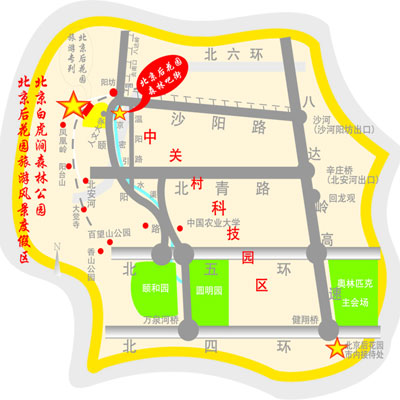 北京后花园位于中关村西北,距市区二十九公里,占地面积七百七十八万平方米。由北京白虎涧森林公园、后花园客栈、原始天体浴场、森林沙滩浴场、延安窑洞伟人居、狩猎射击场、创吉尼斯世界纪录的四岁神童徒手高空走钢丝、神童骑摩托车环球飞车走壁、天下第一车——游客高空骑自行车飞车越极限和筹建中的天下第一桥、千年古城(原始部落、唐、宋、金、元、明、 清)度假区、传媒寨、长寿寨、野外生存寨、滑雪场、古寺庙修复区、猴山、中华大圣、影视基地等三十六个景区和五百余处景观组成。其中有“燕平八景” 中的“神岭千峰”和“虎峪辉金”二景;迷人的通天八十一洞;奇特的十八神潭等集雄、奇、险、秀、峻、幽于一体的现有自然景观二百余处。