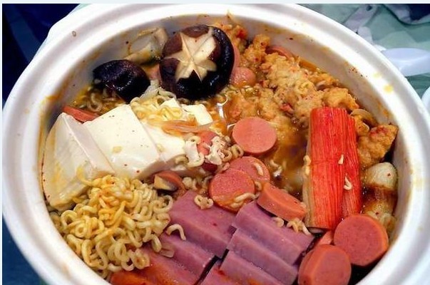 材 料:泡菜300g,泡面1包,罐头火腿1罐,热狗2根,香菇200g,洋葱1颗,豆腐1块,火锅料适量
