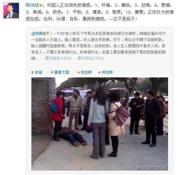 @陈伟鸿:中国人正在消失的情感:1、忏悔;2、善良;3、悲悯;4、爱情;5、真诚;6、胆色;7、平和;8、谦卑;9、敬畏;10、博爱。正在壮大的情感包括:功利、冷漠、自私、暴戾和猥琐。---这不是段子!