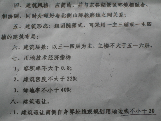 据我所知, 一份东谷湖宾馆地块规划设计条件第八条有明显规定,具体内容如下