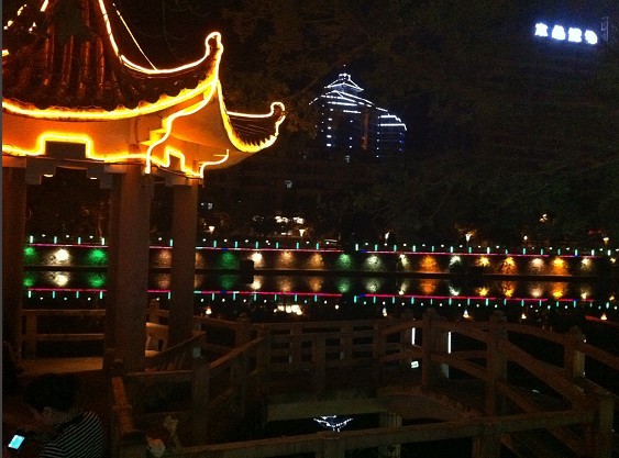 五指山市离三亚一个半小时的车程。其中一小时十分钟走的是盘山公路。这山沟沟里的城市,夜晚没啥可装饰。只能借助于花里胡俏的灯光。