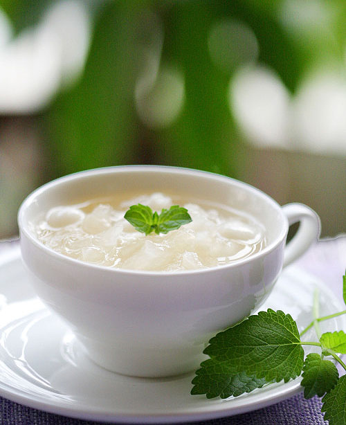 按:银耳又名白木耳,含蛋白质、碳水化合物、矿物质、维生素B 等营养成分,具有滋阴润肺、养胃生津等功效。酒酿为糯米和酒曲酿制而成,性味甘辛、温。具有益气、生津。活血、发痘的功效。两者组成此食品,具有滋阴益气、润肺生津的功效。可治疗干咳少痰、喉干痒、痰中带血、口干渴,大便干结、痰火便血等病症。健康人食之,补充营养,强健身体,泽肤健美。