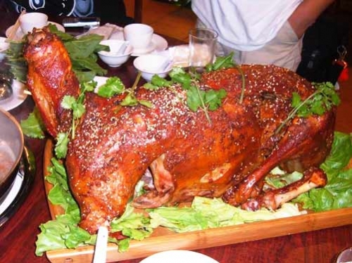 到了13世纪即元朝时期,肉食方法和饮膳都已有了极大改进。《朴通事·柳蒸羊》,对烤羊肉作了较详细的记载:“元代有柳蒸羊,于地作炉三尺,周围以火烧,令全通赤,用铁箅盛羊,上用柳子盖覆土封,以熟为度。”不但制作复杂讲究,而且用了专门的烤炉。至清代各地蒙古族王府几乎都以烤全羊待上宾,其名贵列入礼节。康熙、乾隆年间,北京的“罗王府”(罗卜藏多尔济)中的烤全羊,遐迩京师,名气很大,甚至连厨师嗄如迪(蒙古族)也很出名。清末民初直至解放初,各地王府中还有烤全羊。解放后,不但恢复了这道名菜,而且有了许多改进。