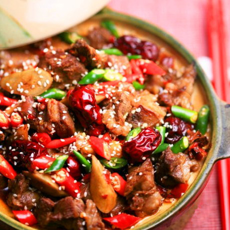 4、转入砂锅中炖一小时放入红枣、牛蒡块,改小火盖盖炖20分钟后,放入冰糖、酱油、盐调味,开盖炖5分钟大火收汁,最后撒上青红椒块,香菜、熟芝麻。
