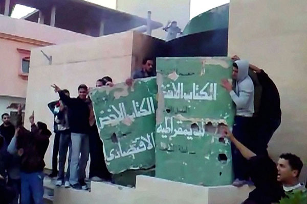 当地时间2月17日,利比亚港口城市托布鲁克,反对派示威者推倒一面卡扎菲《绿皮书》的纪念墙。利比亚反对派团体将本月17日称为“愤怒日”,在班加西发动大规模示威游行并与警方爆发冲突,造成多人死亡。有评论认为,利比亚领导人卡扎菲面临执政41年来最严峻的挑战。