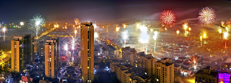 新年的钟声敲响了。烟花渐渐平息,留下的余烟犹如平流雾,淡淡地弥漫在楼群间,恰似仙境……