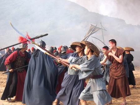 据该剧制片主任何文介绍,剧组将在象山影视城和东陈、黄避岙等地取景拍摄“倭寇袭城”、“海滩抗倭”、“马踏青苗”等多个主要剧情。图为拍摄现场。(陈 峰 励茂权) |
