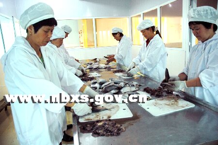 受“脱脂大黄鱼”的启发,禁渔期间,象山海鲜王食品有限公司利用冷风烘干技术,成功开发了“脱水鲳鱼”新产品,为广大市民送上了一份难得的海鲜食品。图为公司员工正在加工“脱水鲳鱼”。(记者  吕茂盛  吴春研  通讯员 王文杰)