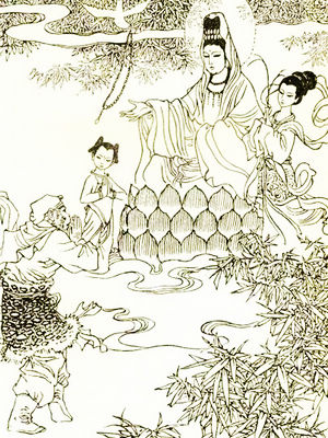 观世音菩萨(梵名Avalokites‘vara),又有观自在、观音等名,被称为救世菩萨、施无畏者、莲花手、普门、大悲圣者。在大乘佛教中,是最为人所熟知的菩萨,以大悲示现,循声救苦,誓愿拔除一切众生的苦难。