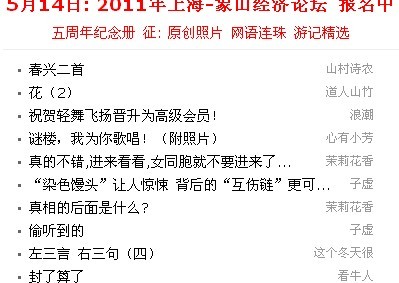 在此我也顺便提个建议吧,个人感觉最新帖子在首页显示的条目可以更多一些,新帖太容易被压沉了,昨天我发了 ... 飘儿 发表于 2011-4-16 13:46
