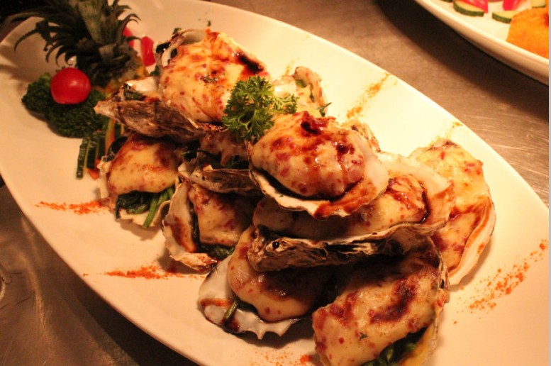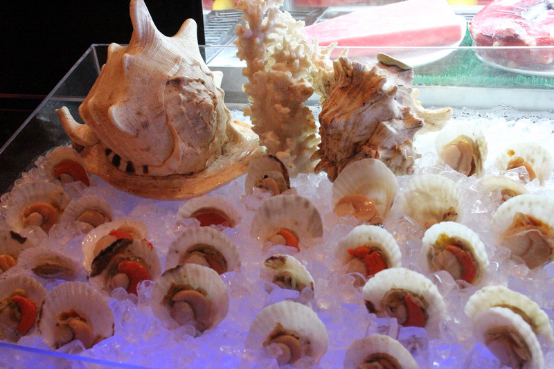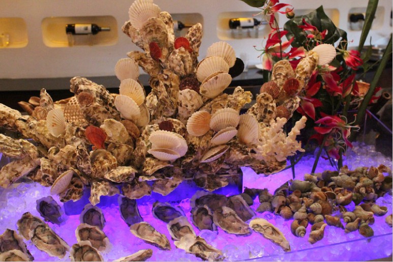 鲜丽的地中海甜对虾塔、诱人的诺曼底雪蟹腿、醇香扑鼻的普罗旺斯焗生蚝、嗞嗞作响的地中海煎海鲈鱼、清新欲滴的蓝莓慕斯蛋糕,更有冰镇啤酒及数款果汁无限量畅饮。