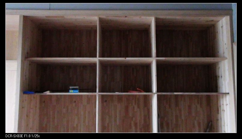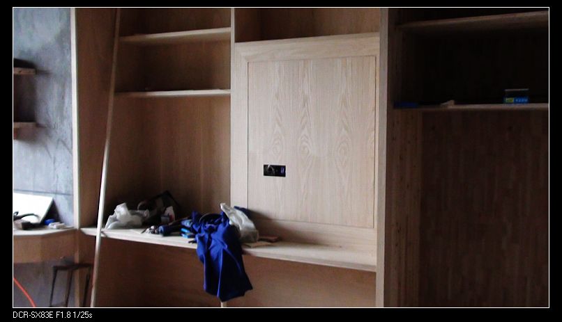 主卧靠窗位置是个电脑桌和贴壁的书架,旁边是电视背景及置物架