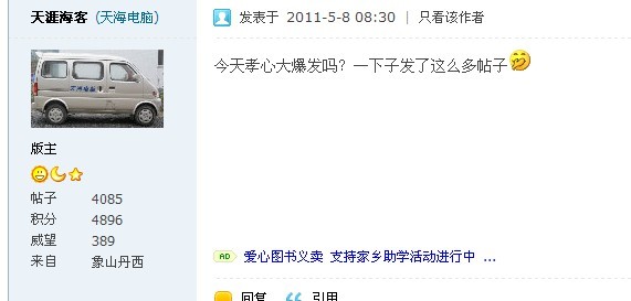 回贴多不多不是冷不冷漠的关系,是人缘好不好的关系。象六株头这样随便点个5-6点人家跟的帖子都可以翻好几页 ... 纨绔 发表于 2011-5-8 11:29