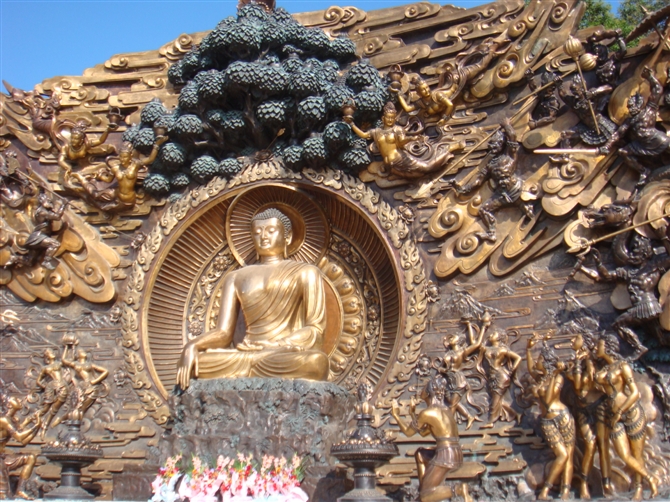 摩耶夫人十月怀胎渐渐的满足,按照当地的风俗,孕妇要去娘家生产。一天,正在春末夏初的月圆之日,这是一个风和日暖天朗气清的好日子,于是摩耶夫人在众多侍女的护送下回娘家生太子,在途中经过一片寂静的树林,林中开满了各种美丽的鲜花,此时的美景打动了摩耶夫人,于是,摩耶夫人决定先去林中赏花!当摩耶夫人走到一棵正长得蓊郁葱茏的无忧树下时,太子诞生于人间!刚生下太子的摩耶夫人,没有感到一点苦恼,刚出生的太子也非常安祥。太子的降诞,是有着种种殊胜稀有的瑞相。他在诞生后不久时,自动的行走七步,每走一步,足下便长出现一朵莲花,举目眺望着四方,一手指天,一手指地,口中呱呱似的说道“天上天下,唯我独尊”!这就是释迦摩尼佛的诞生!