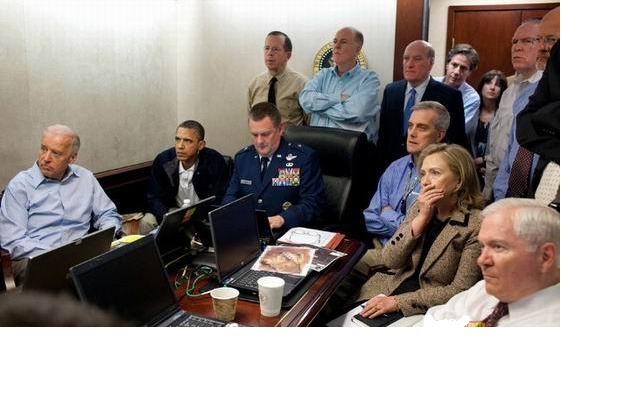 网上有白宫决策捕杀本·拉登的现场照片,其中一幅是海豹突击队在巴基斯坦执行捕杀拉登的任务时,奥巴马和幕僚们在白宫局势研究室(Situation Room),目不转睛地盯着屏幕,监看卫星实时传送的视频。(图中左起副总统拜登、总统奥巴马,右起国防部长盖茨、国务卿希拉里。希拉里前面一份文档因为保密原因,被打上马赛克。)