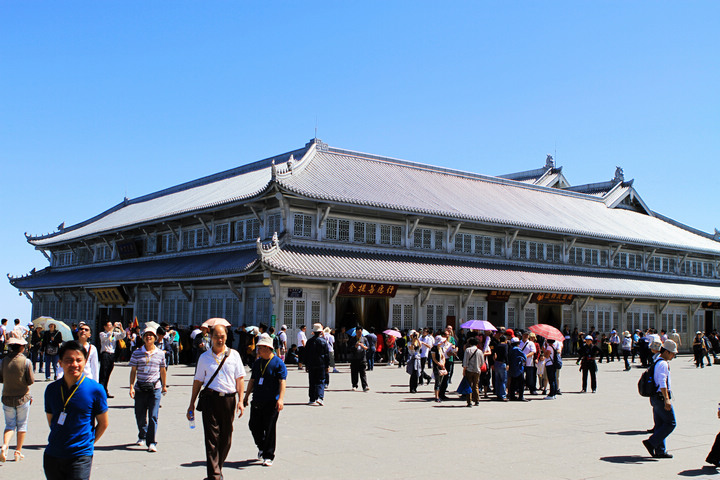 在世界最高的佛教观景平台,由金银佛殿和金光灿烂的镇山之宝四方十面普贤金像(通高48米,重达600多吨)共同形成的金顶佛教胜景。