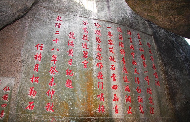 天界寺后顶峰有二块巨石,一块上刻“仙岩”,一块上镌“天界”,远远望去,二块巨石宛如骆驼伏地,故醉仙岩又称“骆驼峰”。二石之间有段颇陡的蹬道,尽处就是“长啸洞”,两头贯通,长风呼啸,凉爽异常。洞壁刻有明代抗倭将领的征倭唱和诗。