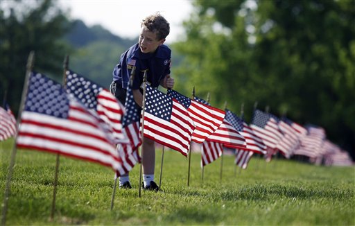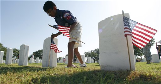 5月27日,美国各地的童子军为阵亡战士公墓插放美国旗帜,纪念国殇日,缅怀阵亡战士。周一(5月30日)为国殇日。图为新泽西州900名童子军在为3.9万个公墓墓穴插放小美国国旗。