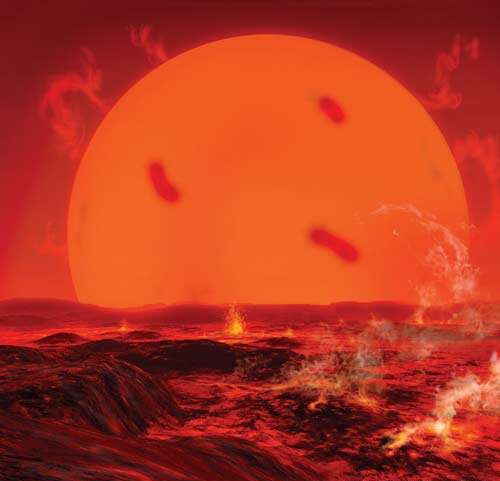 奄奄一息的太阳开始膨胀并吞噬了太阳系所有内行星(inner planets,即水星和金星),地球也随之蒸发殆尽。