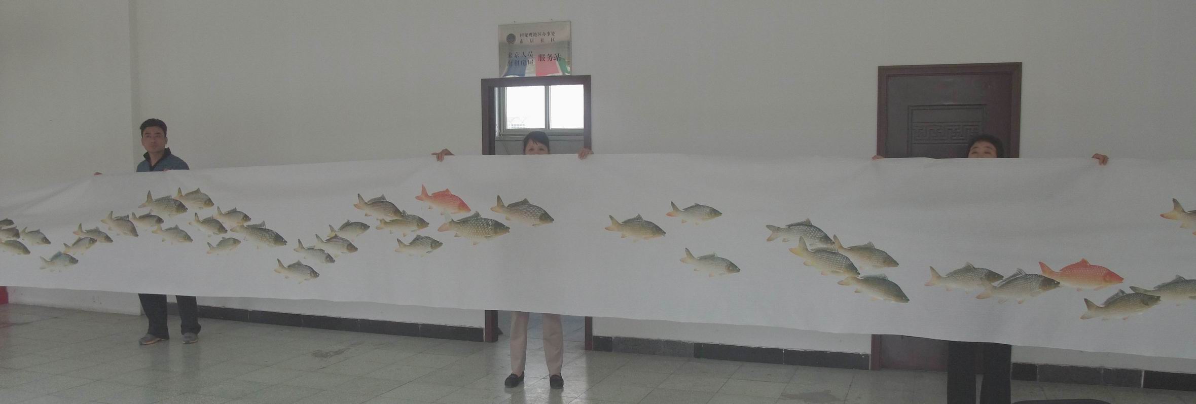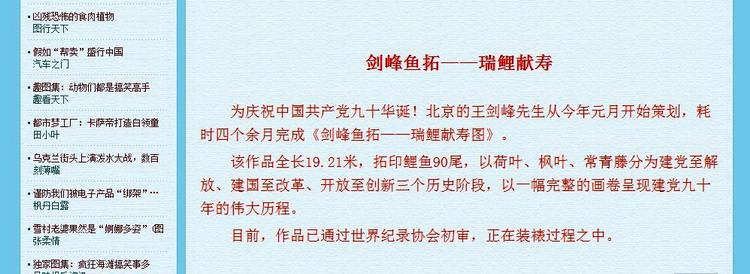 热烈庆祝党九十华诞!此幅作品全长19.21米,从今年元月开始策划到端午节完成,耗时4个多月,共拓印鲤鱼90尾,以表己奋扬喜悦之心。此卷以建党至解放,建国到改革,开放至创新,分别以荷叶,枫叶,常青藤划分,三个阶段组成一副完整画卷,呈现出在党的领导下,一路走来艰辛与伟大的历程。目前已通过世界纪录协会初审,正在装裱过程当中。