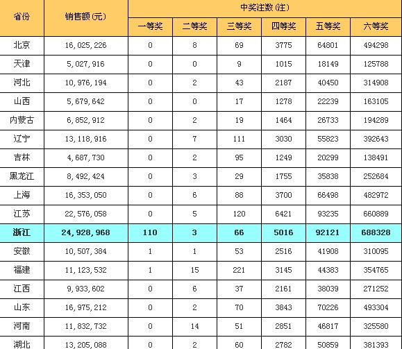 浙江新昌县独揽110注双色球头奖 在昨晚的开奖结果中,514万元每注的双色球大奖,全国共开出113注,浙江独占其中的110注,总金额高达5.6亿多元。根据电脑检索结果,中奖号码来自浙江新昌县的两个彩票站点卖出的三张彩票。一个站点位于新昌服务街45号(编号33040602),卖出的两张彩票前后相差1分钟,一张在昨天下午1时49分打出,另一张于1时50分打出,就是这前后相差一分钟的两张彩票,各中50注,总共中100注,获奖金5.14亿人民币,也就是说,本期双色球至少诞生了两个2.57亿巨奖,据福彩中心的工作人员分析,这100注应为同一人买得,那么此人将独揽5.14亿超级巨奖。