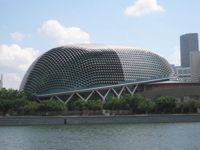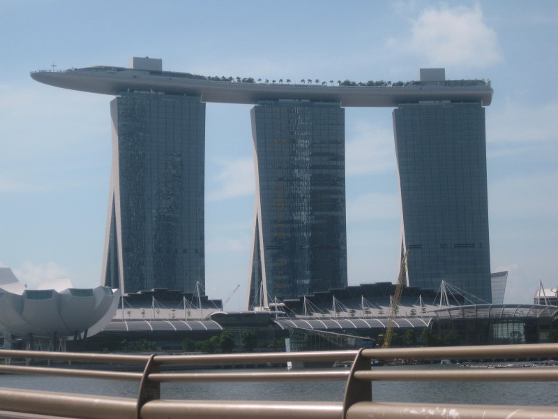 新加坡金沙赌场,房顶像条船,有空中花园之称,顶上有三个游泳池和咖啡厅等。