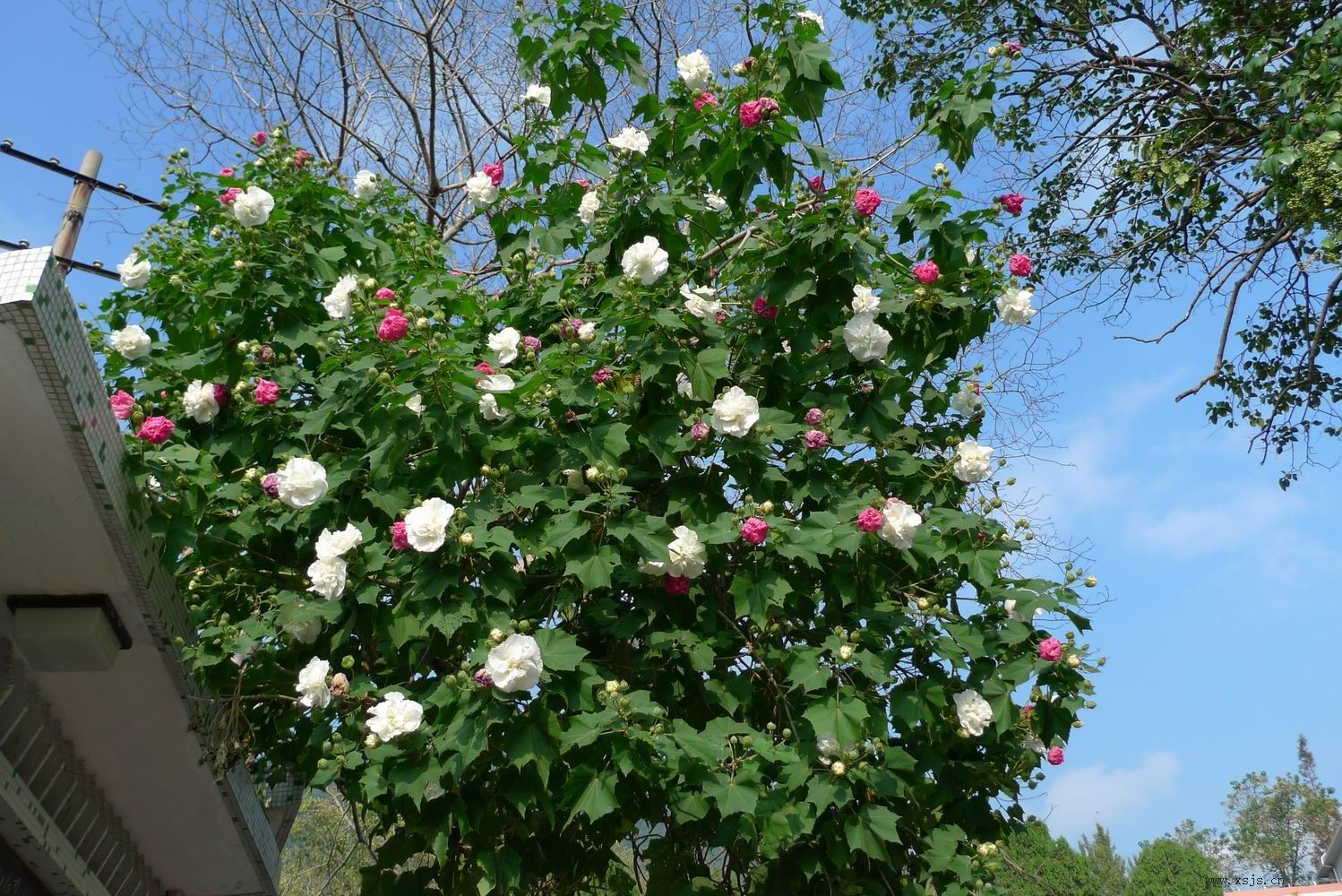 我的母校,很多处都有芙蓉树,最醒目是校门进来的墙报外的这株,