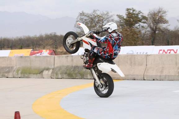 赛道上一哥们正在单轮行驶摩托~~~~后来才知道,这哥们原来是特邀的汽车特技表演队的,这次的特技表演还不错,表演也很成功。