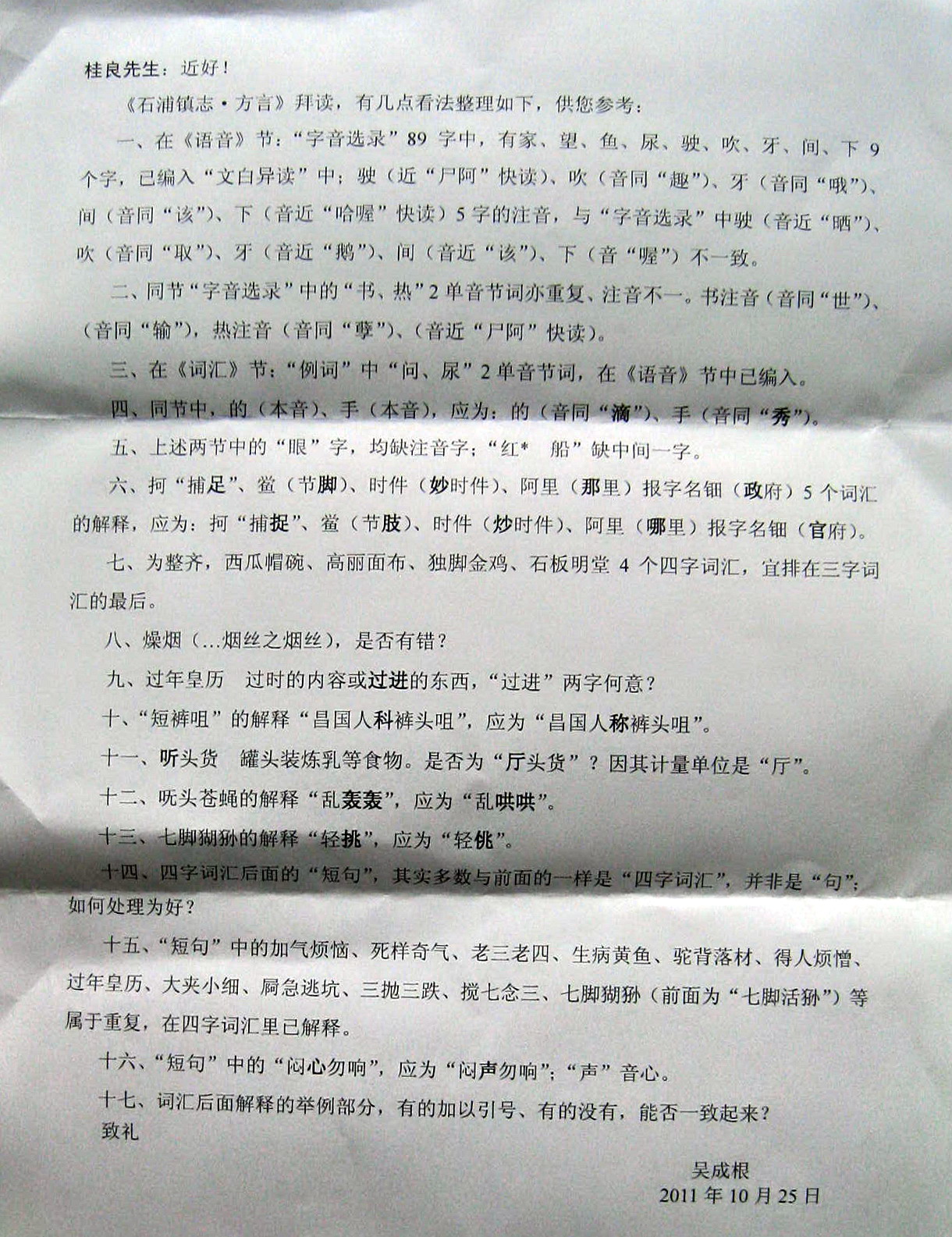 《石浦镇志•方言》拜读,有几点看法整理如下,供您参考: