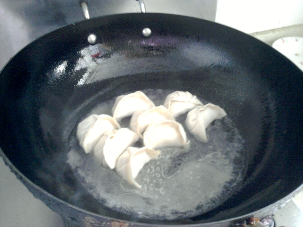2、接下来均匀的在饺子周围洒上一些水,因为油可以把饺子的底部煎熟,但饺子的上部和中部需要水蒸熟。水深约2厘米(如果是现包的就只需1厘米的水深哦)盖上锅盖,煎烙三至五分钟后,看到饺子皮变成透明的颜色,就可以起锅了!