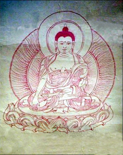 这幅“释迦牟尼坐像图”长60厘米、宽40厘米,画中佛祖结跏跌坐于莲花座之上,笔法细腻,呈现一种藏传佛教的风格。画左下方有款题:“戊寅冬十一月先妣忌日刺血敬绘。如来圣像伏头不违誓接引慈灵永安法界,浦儒稽首回向。”