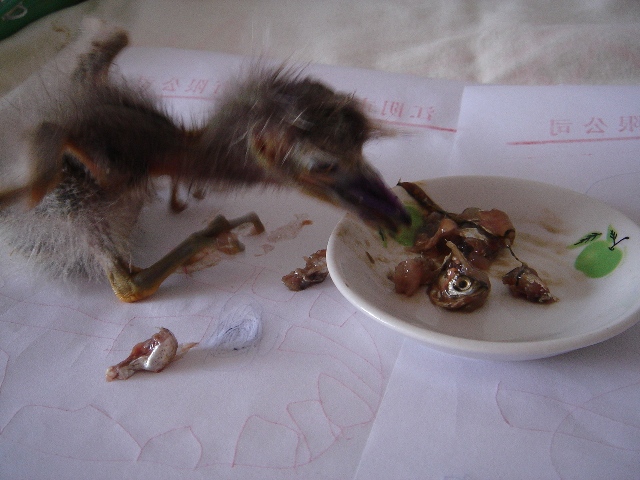 早上起来,LP和女儿已经去菜场买了一些小鱼回来,剁碎了给小鸟喂食。看来这只鸟的胃口真的很不错,吃东西时那个叫狼吞虎咽啊。