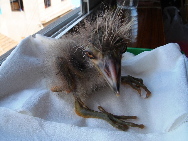回家观察,该鸟长相奇特,嘴巴的尺寸占身体的比例很大,眼球突起,下半身和爪子均呈青绿色。同时发现其鼻孔里居然长有蛆虫。我爱人于是帮其清理掉蛆虫,并帮其进行全身清洗,然后用少量消炎药水化后涂抹在其鼻孔上。