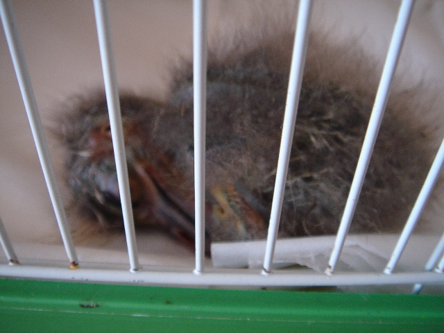 清晨,我爱人与女儿去附近山上爬山,至山顶时,发现一只雏鸟跌落在路边草丛中,旁边没有大鸟,附近也没有鸟窝,只好把该雏鸟带回家中。
